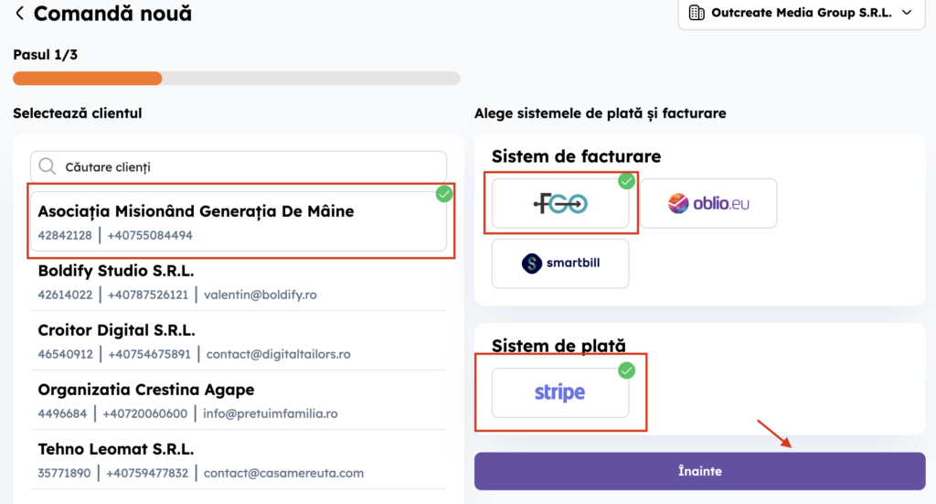 3. Selectează clientul și alege softul de facturare și de plată